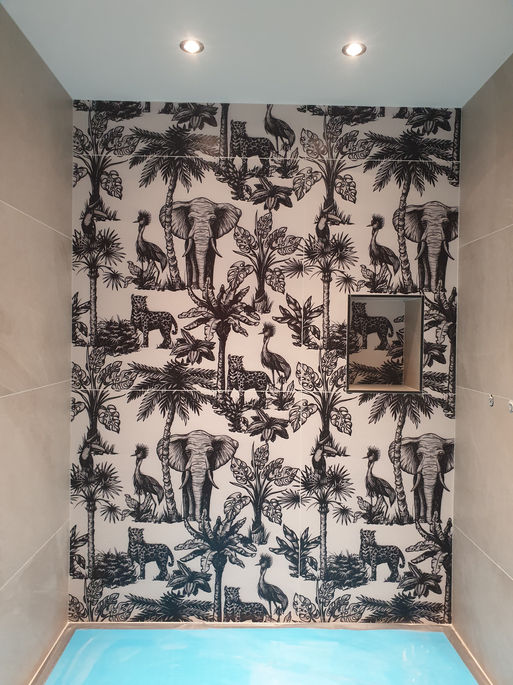 Une demande originale avec un pan de mur animalier noir et blanc au dessus d'une belle douche à l'italienne.